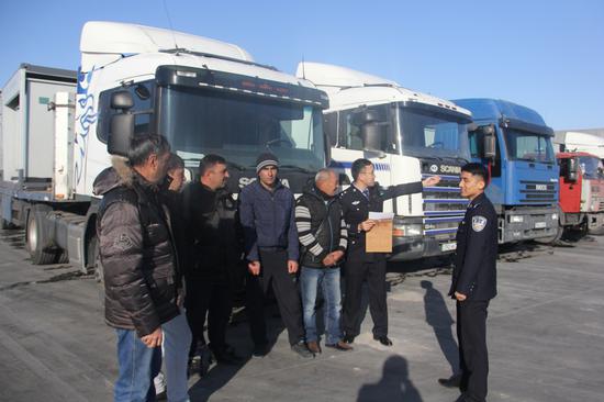 圖為執勤人員為貨車司機講解出入境邊防檢查手續流程、提供翻譯幫助等服務舉措。