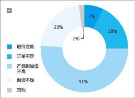 中國造船業以造船接單量和完成量計算,已占居全球最大份額,但是若以賺錢能力計算,恐怕距離首位還有很大距離。顯然,超過50%的調查對象也有同感,認為“產品附加值不高”是造船業最大的軟肋;22%的調查對象認為“融資不足”會成為造船業進一步擴張道路上的絆腳石;18%的調查對象認為造船業將受制于“訂單不足”的困境;7%的調查對象認為“船價過低”將影響造船業未來發展;2%的調查對象選擇“其他”,他們或許有其他的思考。