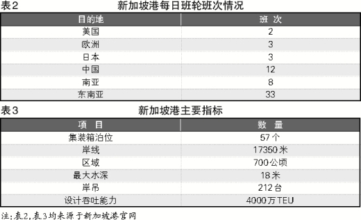 新加坡港的地理位置優越,西臨馬六甲海峽東南側,南臨新加坡海峽北側,扼太平洋與印度洋之間的航運要道。從新加坡港每日班輪班次來看,無疑是一個繁忙的港口(見表2)。