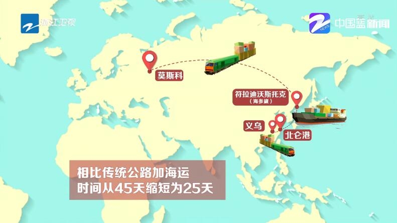 這條新開辟的航線采用“鐵海鐵”聯運模式,商品從義烏坐列車直達北侖港,再乘船抵達海參崴,轉列車抵達莫斯科。相比傳統的公路加海運,“鐵海鐵”聯運的時間從45天縮短為25天。