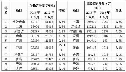 2018年上半年全球top10貨物吞吐量及集裝箱吞吐量港口生產(chǎn)情況: