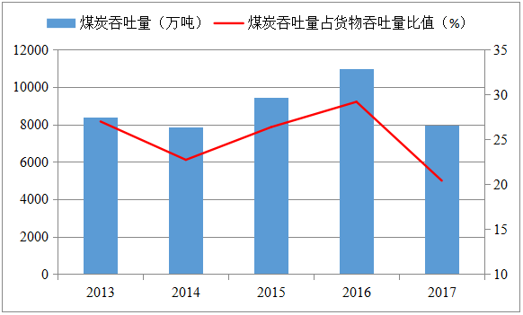 圖1 天津港股份有限公司煤炭吞吐量及其占貨物吞吐總量比例(2013-2017)