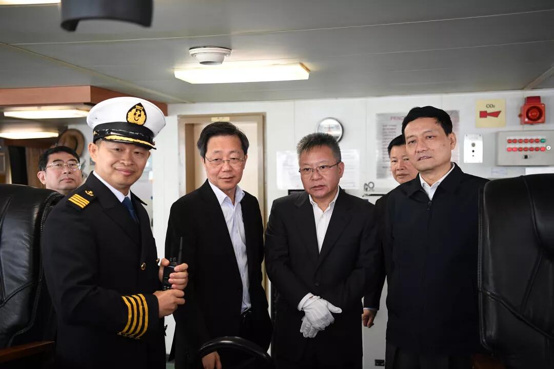 首航儀式開始前,肖亞慶、沈曉明、王路等一行在許立榮的陪同下,觀看了海南洋浦港接入國際陸海貿易新通道的展板介紹,并在儀式結束后,登上中遠海運“新防城”輪,慰問了船員。
