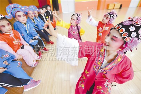 區(qū)幼兒園老師指導(dǎo)孩子們學(xué)習(xí)京劇表演