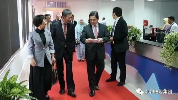中國駐文萊大使楊健(左一)、文萊財(cái)政部副部長拿督阿敏(右二)在廣西北部灣國際港務(wù)集團(tuán)董事長周小溪(左二)帶領(lǐng)下參觀摩拉港有限公司辦公室