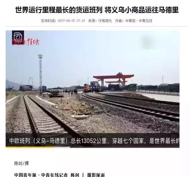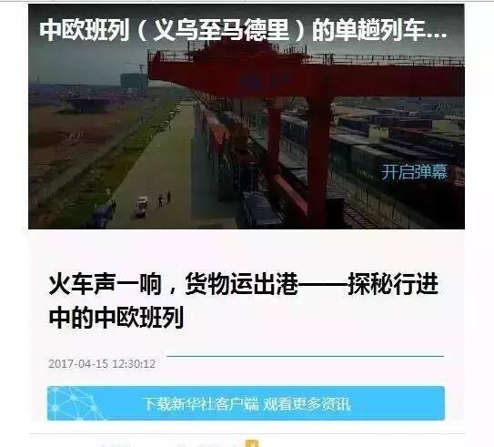 4月15日上午,伴著火車(chē)機(jī)頭的汽笛聲,上鐵金華貨運(yùn)中心義烏貨運(yùn)西站的一趟“中歐班列”開(kāi)始啟動(dòng)。在接下來(lái)的18天行程里,它們將縱橫13052公里,經(jīng)阿拉山口出境,途經(jīng)哈薩克斯坦、俄羅斯、白俄羅斯、波蘭、德國(guó)、法國(guó)至西班牙馬德里。古絲綢之路被鋼鐵信息化的新絲路所取代,新的征程正在上演。這也引起了媒體的集中關(guān)注,看看媒體都是怎么報(bào)道的?