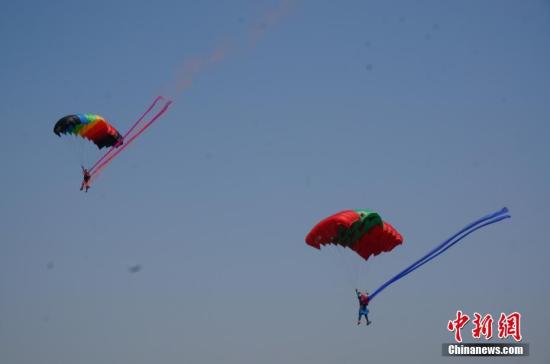 4月27日,2017鄭州航展暨世界編隊特技飛行年度頒獎盛典在鄭州上街機場開幕。開幕式上,由河南跳傘表演隊的24名跳傘隊員攜帶國旗、彩煙焰火、綢帶從天而降,扮靚晴空,為2017鄭州航展助興。在陣陣歡呼中,觀眾紛紛舉起手中相機拍照,記錄這一精彩時刻。