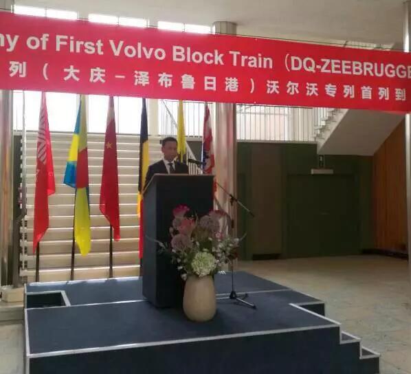 比利時副首相兼經濟和就業大臣克里斯·佩特斯、中國駐比利時大使曲星、哈歐國際物流股份有限公司董事長薄世久、黑龍江省政府代表團、大慶市政府代表團等100多位嘉賓出席了當天在澤布魯日港舉行的中歐班列“大慶—澤布魯日”沃爾沃專列的接車儀式。