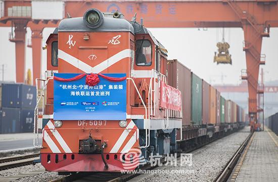 隨著一聲汽笛長鳴,11日下午,半山腳下的杭州北永寧貨場,一列滿載40個出口貨物集裝箱的列車緩緩駛出,標志著“杭州北-寧波舟山港”海鐵聯運集裝箱班列正式開行。